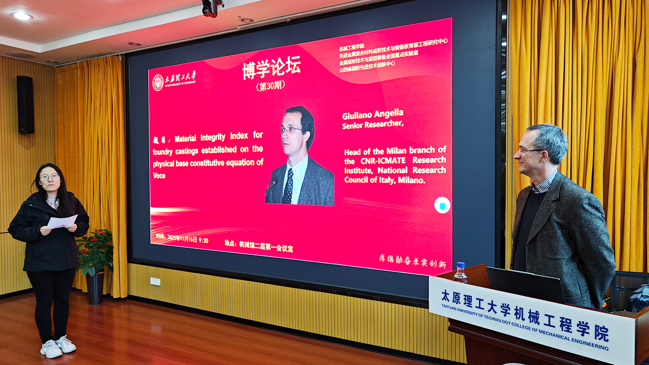 为进一步扩展我院师生国际学术视野,提升整体学术水平,2025年11月16日,机械工程学院特邀意大利国家研究委员会-凝聚态物理与化学研究所米兰分部的负责人-Giuliano Angella教授来院做学术报告,这也是学院举办的第30期“博学论坛”。太原理工大学机械工程学院焦少妮老师主持本次论坛,学院党委书记武佐君、骨干教师、部分博士、硕士研究生参加报告会。