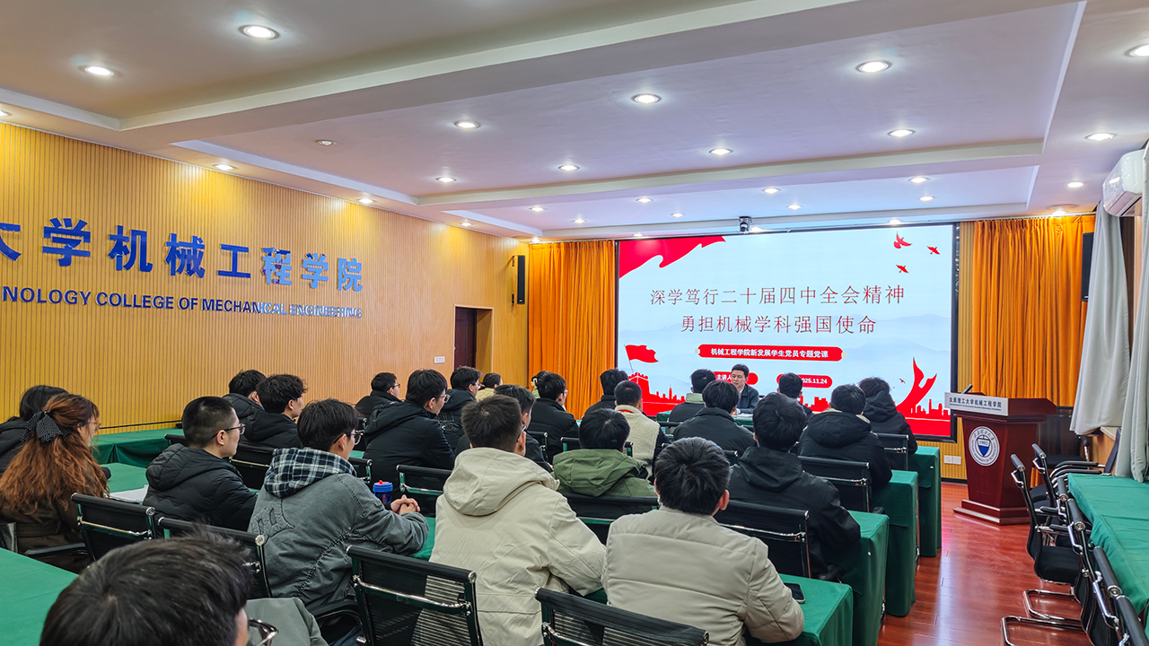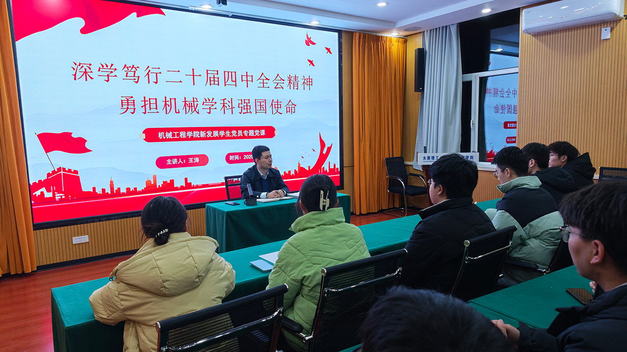 为深入学习贯彻党的二十届四中全会精神,加强研究生党员理想信念教育,11月24日,机械工程学院院长王涛教授在机械馆二层大会议室,以“深学笃行党的二十届四中全会精神 勇担机械学科强国使命”为主题,为新发展研究生党员讲授专题党课。