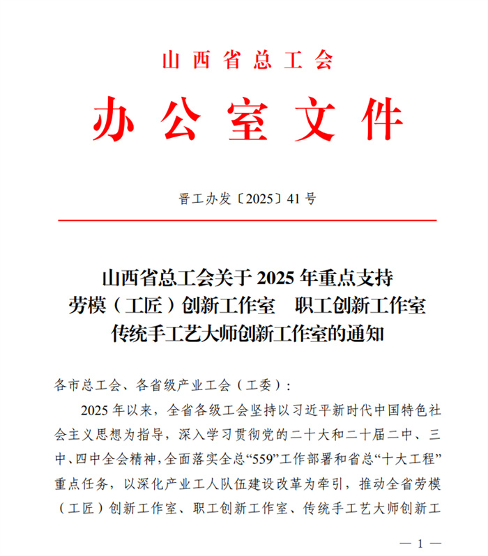 近日,为进一步激励广大劳模(工匠)更好发挥示范带头作用,推动深化产业工人队伍建设改革举措落地见效,山西省总工会下发《山西省总工会关于2025年重点支持劳模(工匠)创新工作室 职工创新工作室 传统手工艺大师创新工作室的通知》,我校王涛职工创新工作室获评省级职工创新工作室并获重点支持。