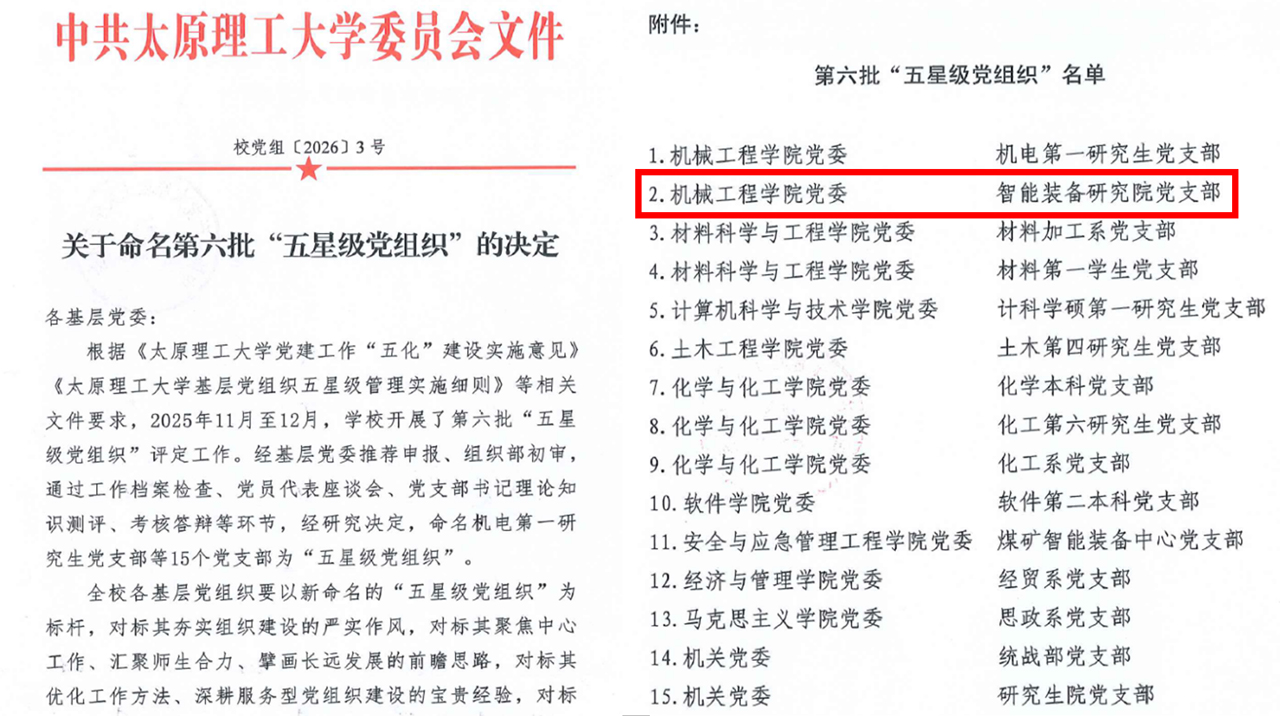 机械工程学院智能装备研究院党支部传来喜讯:根据学校《关于组织开展第六批“五星级党组织”评定及考核工作的通知》的相关要求,在学院党委的大力支持下,经学院党委推荐、学校组织部初审、档案检查、党员代表座谈会、支部书记理论知识测评、考核答辩等多轮严格遴选,智能装备研究院支部成功获评太原理工大学第六批“五星级党组织”荣誉称号。这一荣誉不仅是对支部党建工作的高度肯定,更是支部全体党员凝心聚力、砥砺奋进的生动见证。