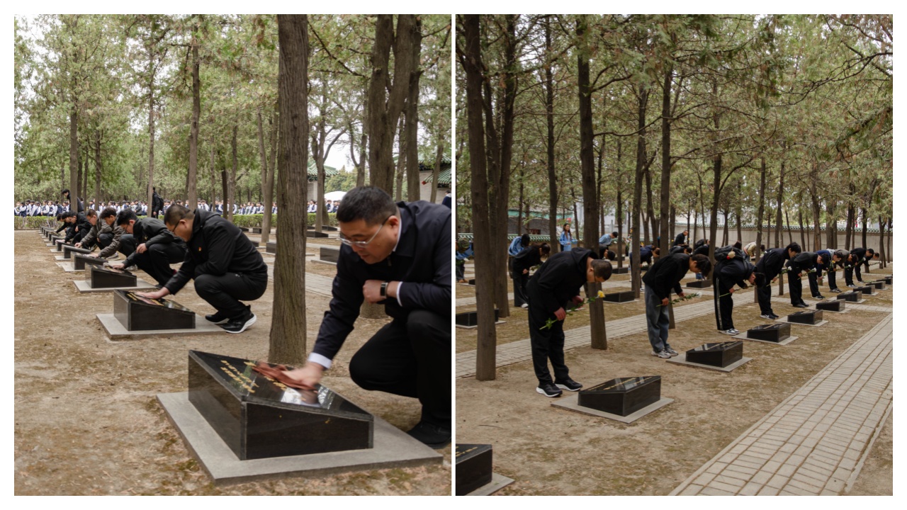 活动现场庄严肃穆。我院师生统一着深色服装,在烈士纪念广场整齐列队。缅怀仪式上,全体人员齐唱国歌,向革命先烈敬献花篮、集体默哀,以表追思。在烈士家书诵读环节,全体人员聆听《追寻——跨越时空的家书》,以赤诚之声缅怀英烈、致敬忠魂。仪式结束后,师生前往缅怀祭扫区,俯身擦拭墓碑尘土,依次敬献单枝鲜花并深深鞠躬,以朴素庄重之举表达对革命先烈的无限哀思与崇高敬意。