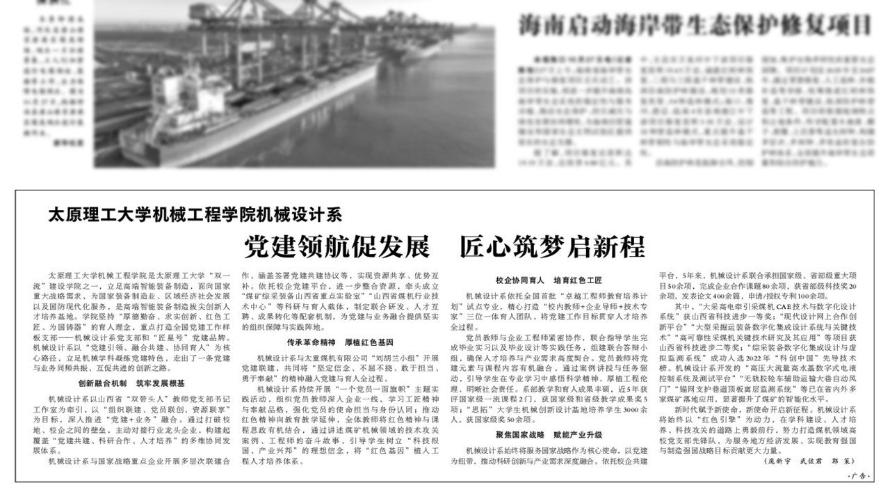 太原理工大学机械工程学院是太原理工大学“双一流”建设学院之一,立足高端智能装备制造,面向国家重大战略需求,为国家装备制造业、区域经济社会发展以及国防现代化服务,是高端智能装备制造拔尖创新人才培养基地。学院坚持“厚德勤奋、求实创新、红色工匠、为国铸器”的育人理念,重点打造全国党建工作样板支部——机械设计系党支部和“匠星号”党建品牌。机械设计系以“党建引领、融合共建、协同育人”为核心路径,立足机械学科凝练党建特色,走出了一条党建与业务同频共振、互促共进的创新之路。