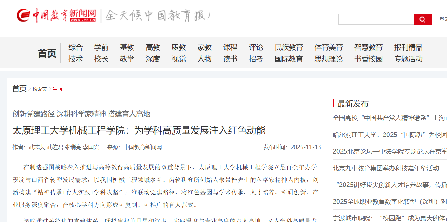 中国教育新闻网:新党建路径 深耕科学家精神 搭建育人高地 太原理工大学机械工程学院:为学科高质量发展注入红色动能