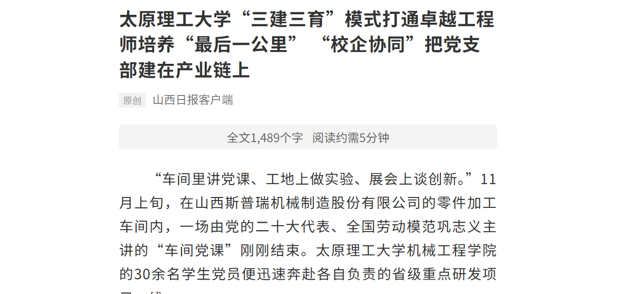 太原理工大学“三建三育”模式打通卓越工程师培养“最后一公里” “校企协同”把党支部建在产业链上